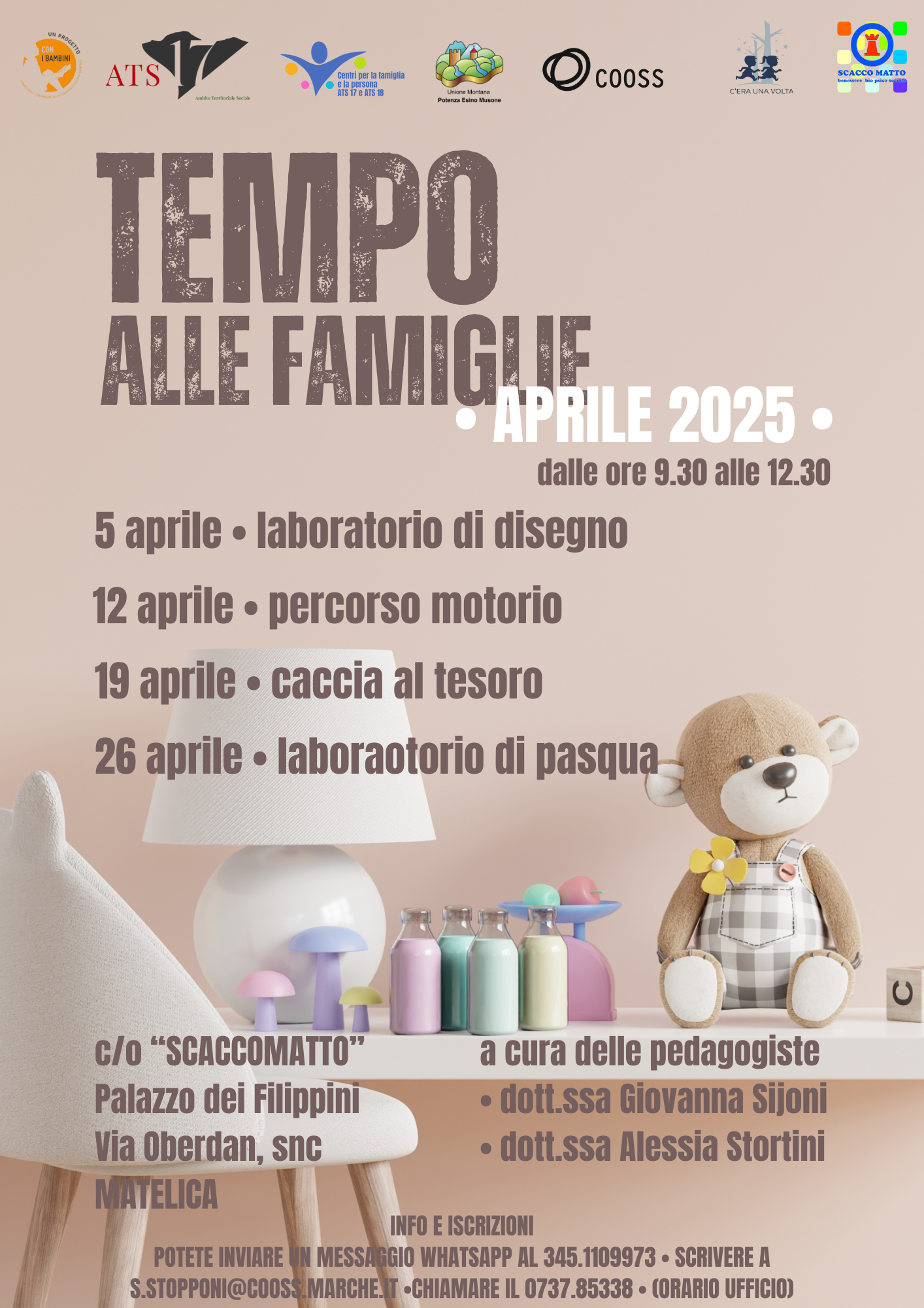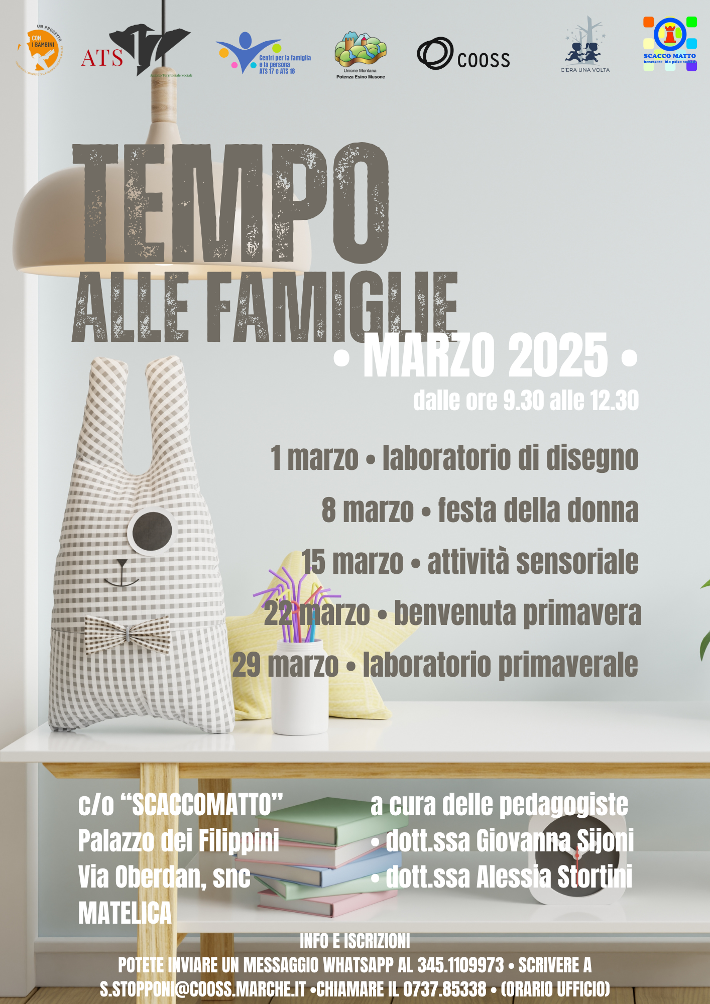 Tempo alle Famiglie è una iniziativa promossa nell’ambito del Progetto “C’era una volta” selezionato dalla Fondazione Con i Bambini nell’ambito del Fondo per il contrasto della povertà educativa minorile e realizzato da COOSS Cooperativa Sociale in collaborazione con l’ Ambito Territoriale Sociale 17 e i Centri Per Famiglie e la Persona dell’ATS 17.